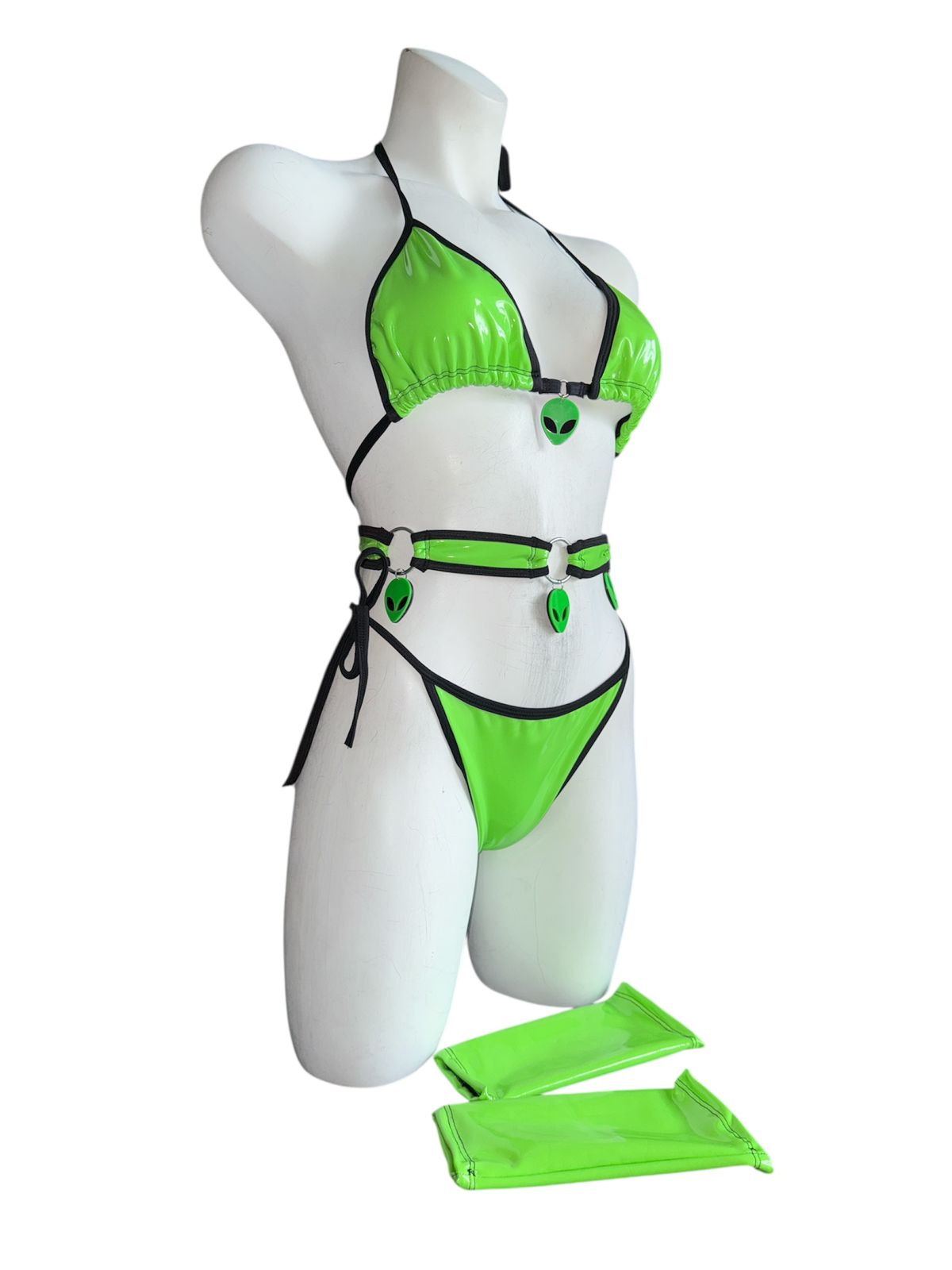 The set includes the top, bikini thong bottom, mini, arm bands and belt.